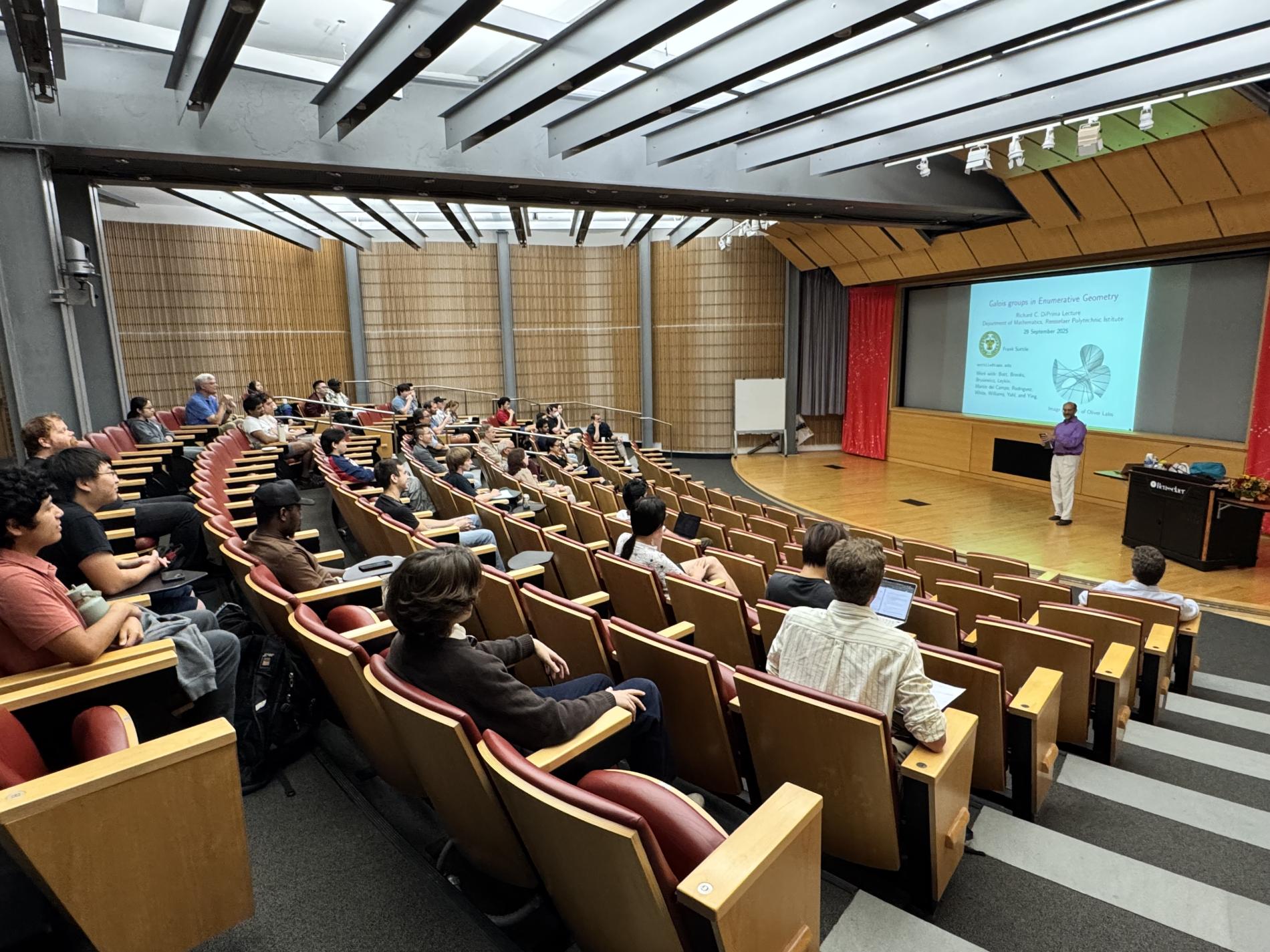 Dr. Sottile’s lively and visual presentation traced the story of how Galois theory, which originally developed in the 19th century to understand polynomial equations, has evolved into a powerful framework for studying modern problems in enumerative geometry. He explained how Galois groups capture the hidden symmetries of geometric structures and how these symmetries reveal underlying connections between algebra, geometry, and computation. To make these ideas tangible, Dr. Sottile brought 3D-printed models of several algebraic varieties, allowing the audience to see and touch the shapes he lectured on. The colorful and intricate prints provided a bridge between abstract theory and physical form, delighting students and faculty alike.