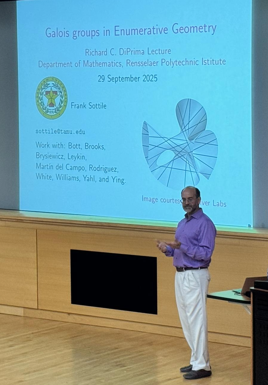 Prof. Dr. Frank Sottile from Texas A&M University visited the Department of Mathematical Sciences on September 29 to deliver the 2025 Richard C. DiPrima Lecture, “Galois Groups in Enumerative Geometry.” The DiPrima Lecture honors and remembers a former faculty member who, through his research, teaching, and service as department chair, was instrumental in the transformation of our department in the 1950s-1980s to a prominent center for the application of mathematics to science and engineering concerns. Stemming from a family of Sicilian immigrants, Dr. Sottile's visit revealed a geographic connection to the DiPrima family; he noted: “An interesting aspect that I learned [when visiting RPI] was that DiPrima’s Sicilian ancestors came from the same region as mine.”