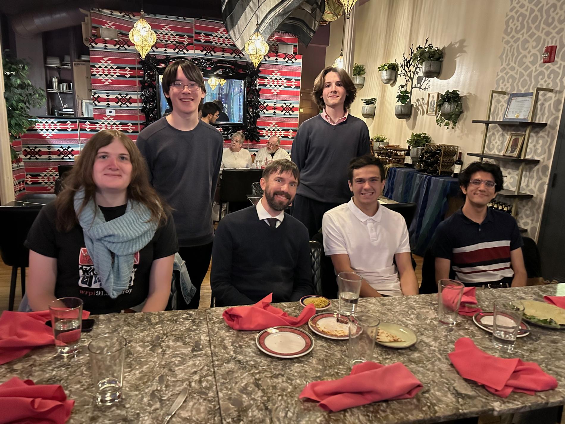Dr. Evans’s visit to RPI featured a MANE seminar “The EXHUME Project: Democratizing Immersed and Meshless Finite Element Analysis,” in which he described software he developed to facilitate the use of immersed finite element methods for solving fluid equations in moving domains such as airflow past flexible wings and blood flow past heart valves. Additionally, Dr. Evans was generous enough with his time to engage directly with RPI students at various levels to share his career perspectives and experience. After his seminar, Dr. Evans went to lunch with graduate students in mathematical sciences pursuing doctoral research in computational mathematics. He also visited the undergraduate Numerical Computing class to share thoughts on career and education with students just beginning to learn about computational mathematics. Finally, Dr. Evans shared advice and perspective over dinner at Tara Kitchen with advanced undergraduate students and early graduate students with interest in computational mathematics and upcoming decisions concerning graduate school or industrial paths. Included in this dinner were the 2025 Mathematical Association of America Prize winners in the Mathematical and Interdisciplinary Contest in Modeling. As a student, Dr. Evans had also received a top prize, his from the Society for Industrial and Applied Mathematics, in the same competition in 2005.